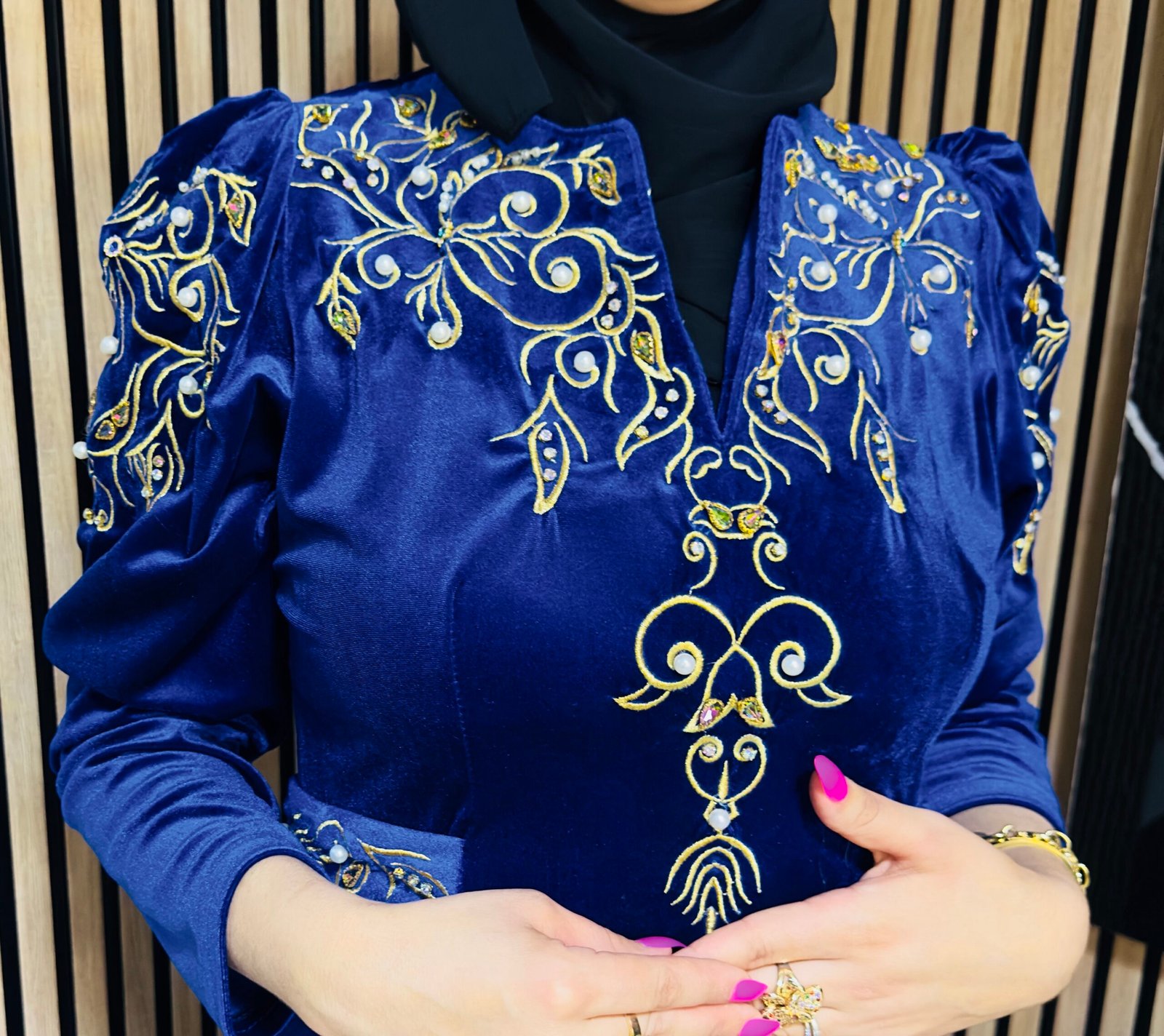 مودال أنيق مطرّز بخيوط الشعرة مع تزيين راقٍ بـ أحجار الجوهر والعقّاش، يمنحك إطلالة ملكية مثالية للمناسبات الخاصة.